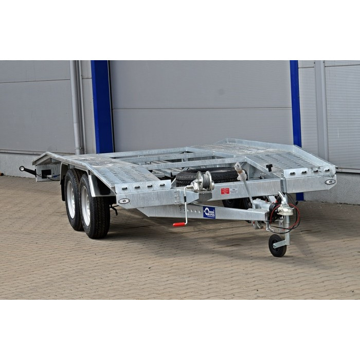 Platforma auto in 2 axe cu sarcina maxima autorizata de 2700 kg, cu sistem de franare, avand sarcina utila de 2110 kg, dimensiuni exterioare de 560x207x76 cm si spatiu util de 450x200x10 cm.