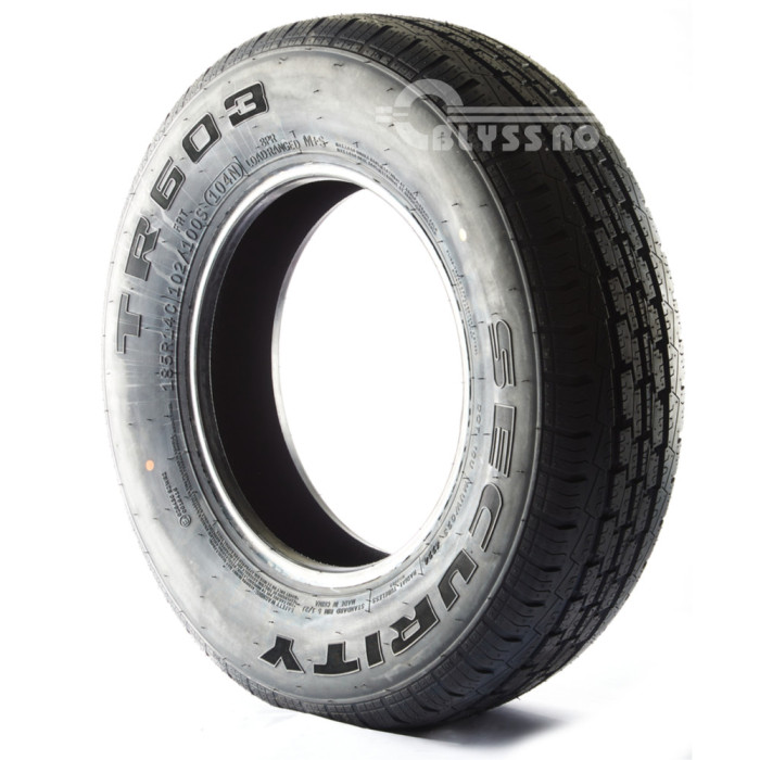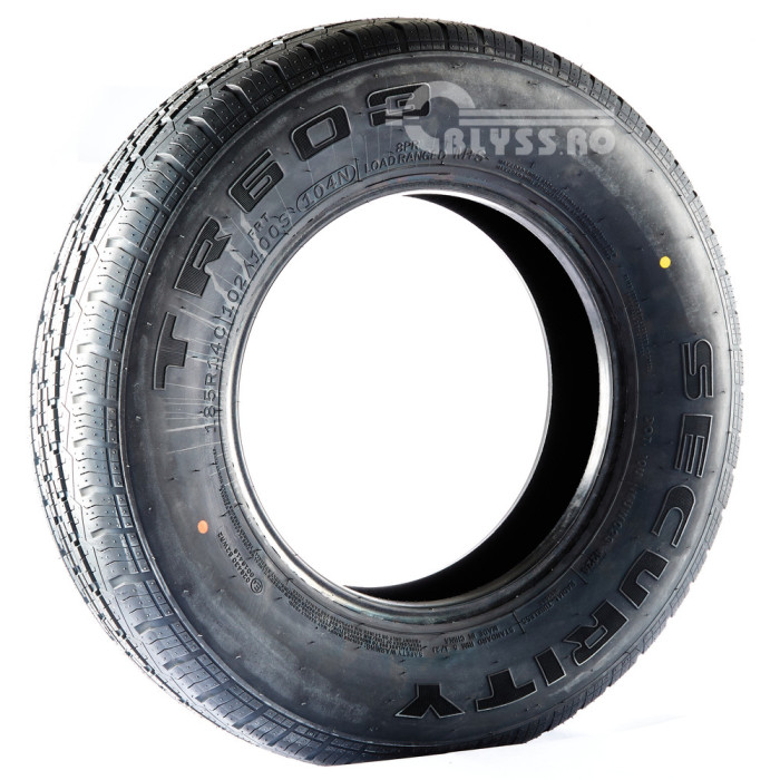 anvelopa security m+s cu structura intarita cu dimensiuni de 185r14c si sarcina maxima de 900kg (clasa 104). este recomandata pentru remorci, platforme. are un indice de viteza n (140km/h) si zgomot la rulare de 72db (clasa b)